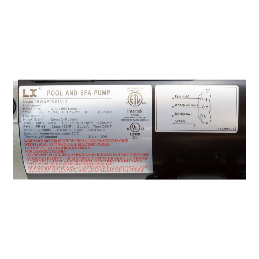 The 48WUA1001C-II is a versatile, 1 HP dual-speed pump designed for efficient water circulation in hot tubs and spas. Operating at 115 volts, it offers both high-speed and low-speed settings to accommodate various spa functions, such as powerful jet action and gentle filtration cycles.