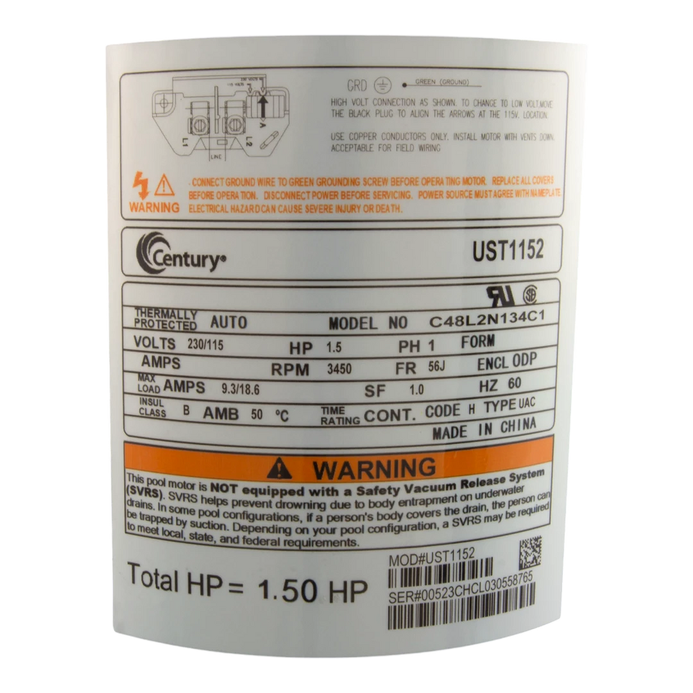 The Century Motors UST1152 is a powerful 1.5 HP pool pump motor designed for efficient performance in swimming pool applications. It operates on both 115V and 230V, with a speed of 3450 RPM, making it compatible with various models, including Hayward Super Pump and Jacuzzi Magnum pumps. Key features include a durable round flange design, a corrosion-resistant outer shell, and a single-phase operation with a permanent split capacitor for enhanced efficiency. This motor is an ideal replacement for existing pool pump motors, ensuring reliable operation and easy installation.