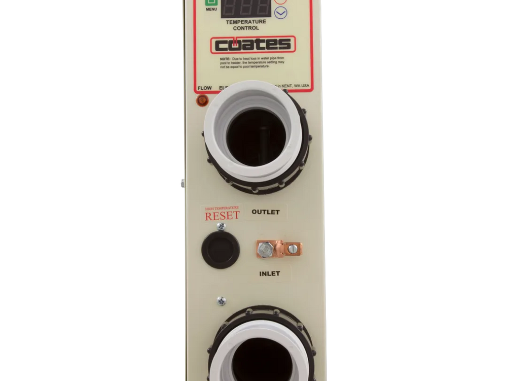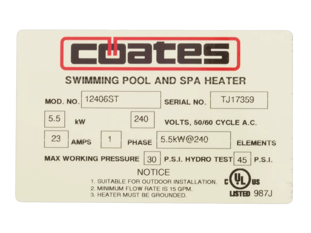 The Coates Heater Co. 12406ST is a 5.5kW electric spa heater from the ST series, operating at 240 volts and 23 amps in a single-phase configuration. It features a stainless steel tank with a built-in flow switch to prevent operation without water flow and supports flow rates between 15 GPM to 80 GPM.