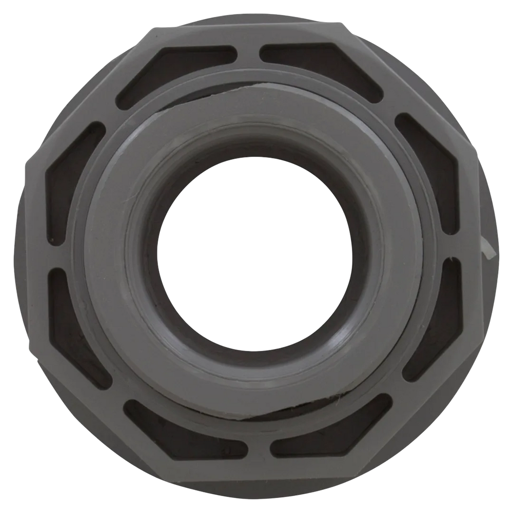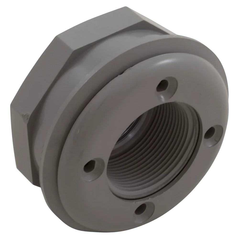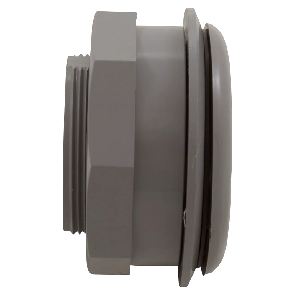 The CMP 25522-001-000 Wall Return Fitting is a complete directional inlet assembly finished in Gray, designed to screw directly into standard 1.5-inch threaded wall fittings. This unit includes the threaded body, an adjustable eyeball for directing water flow, and a locking ring, all constructed from durable, chemical-resistant PVC.