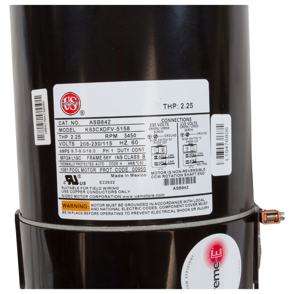 The U.S. Motors ASB842 is a 1.5 HP pool and spa motor designed for efficient performance, featuring a square flange and single-speed operation. It operates at 3450 RPM and is compatible with various in-ground pool pumps, making it an ideal replacement motor for enhancing pool circulation. This energy-efficient model supports a voltage range of 115/208-230V and is constructed for continuous duty, ensuring reliable operation.