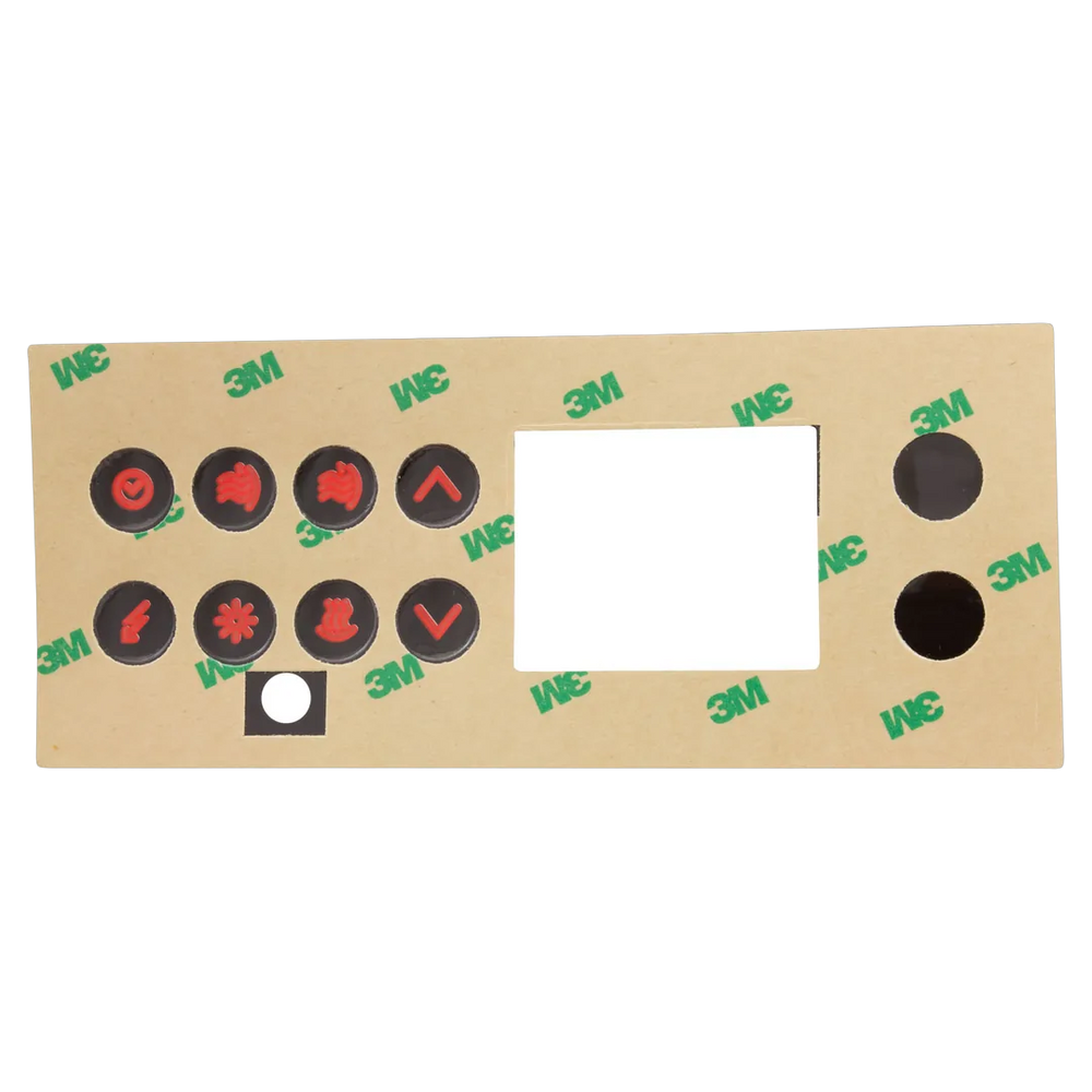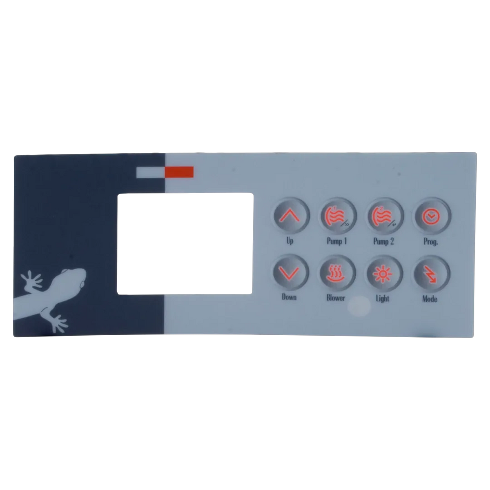 The Gecko 9916-100094 is an 8-key overlay specifically designed for TSC-4 or K-4 control systems from Gecko Alliance. It comprises eight buttons that facilitate intuitive operation, including controls for two pumps, a blower, a light, and temperature adjustments. This overlay is compatible with the TSC-4 and K-4 models, serving as the topside interface for these systems.