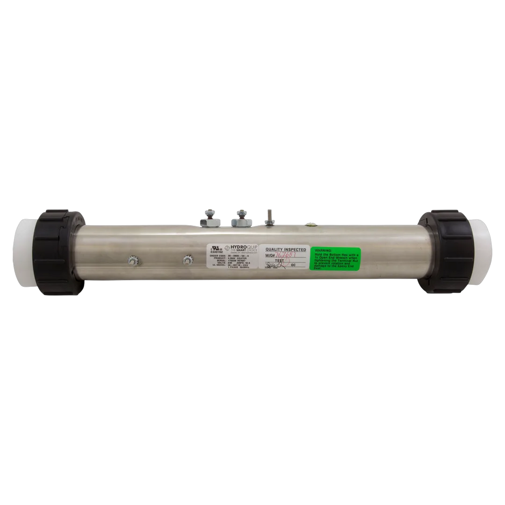 The HydroQuip 26-0800-5S-K is a replacement flo-thru heater assembly designed for use with Gecko S-Class systems, as well as Caldera and Nordic spas. This heater has a wattage of 4.0kW and measures 15 inches in length. It includes necessary components such as unions and O-ring gaskets for installation.