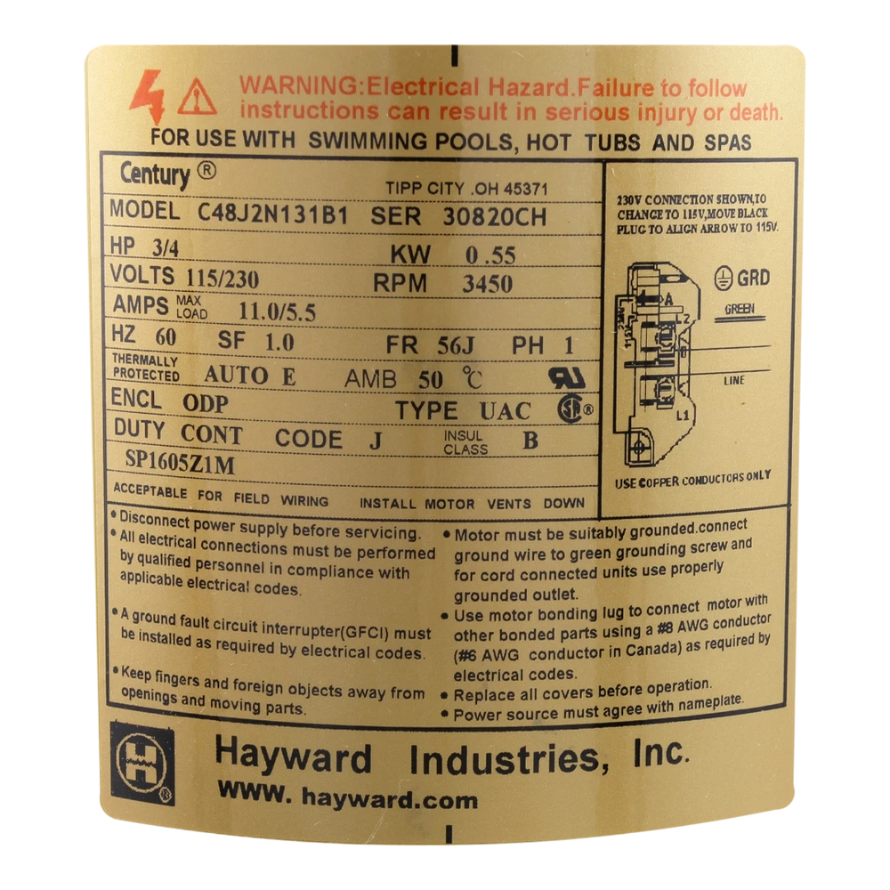Hayward 3/4 HP Replacement Motor for Super Pump - 115/230V - SPX1605Z1M