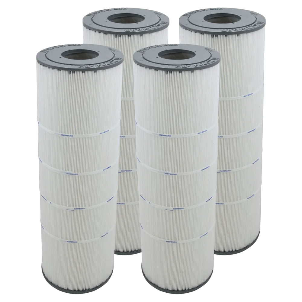 The Hayward CX880XREPAK4 is a 4-pack set of replacement cartridge elements designed for in-ground pool filtration systems. Each cartridge measures 7 inches in diameter and 25 1/4 inches in height, crafted from reinforced polyester pleated material with molded gaskets. It is specifically compatible with Hayward SwimClear filter models C4000, C4020, C4025, and C4030, providing a total filtration area of 425 square feet.