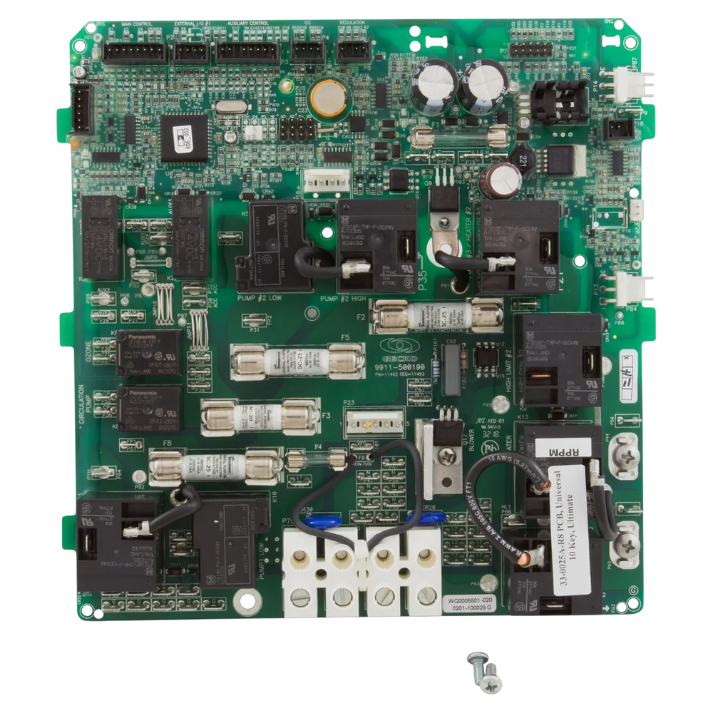 The HydroQuip 33-0025A-K is a spa control printed circuit board for the Ultimate Plus/9700 Series (Digital MP Universal 10-Key), 230V, Rev. 8. It is a PCB assembly that interfaces with a 10-key topside control and accepts temperature sensor 34-0203D and hi-limit sensor 34-0201D.