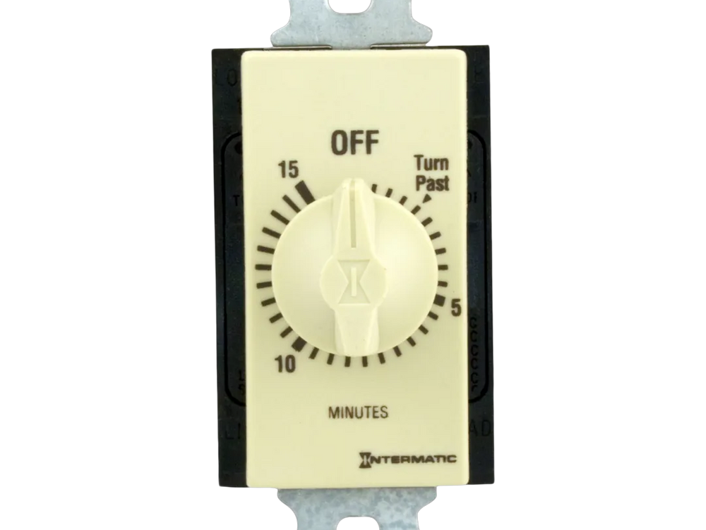 The Intermatic FD415M is a 15-minute spring-wound countdown timer designed to replace standard wall switches in both single and multi-gang configurations. Constructed with an ivory decorator style, it operates without the need for electrical power and is equipped with a DPST mechanism. This timer is compatible with 125-277 VAC, 50/60 Hz systems, making it suitable for controlling lighting, motors, fans, and other energy-consuming loads.