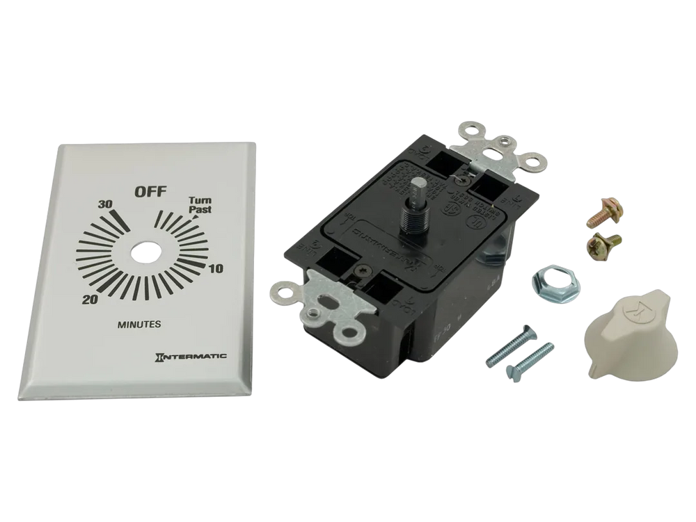 The Intermatic FF30MC is a 30-minute spring-wound countdown timer from the FF Series, manufactured for commercial use. It features a mechanical, auto-off design with single-pole, single-throw (SPST) contacts, and operates at 125-277 VAC. The device includes a wall plate and is suitable for installation in place of a standard wall switch, requiring no electricity to function.