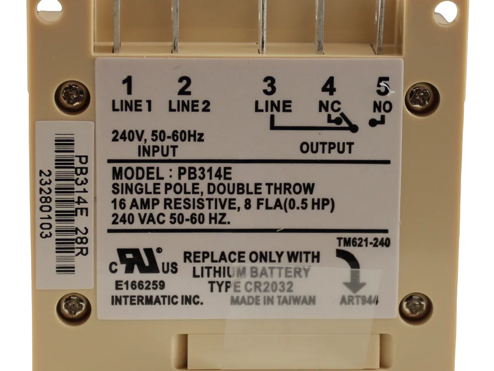 The Intermatic PB314E is a 24-hour electronic panel mount timer designed for cycling equipment on and off up to eight times daily. It operates on a 240V power supply and includes features such as surge resistance and a replaceable lithium battery to maintain its settings. This timer is part of the Intermatic Load Centers series and is suitable for applications requiring reliable timed cycling, such as in spa systems.