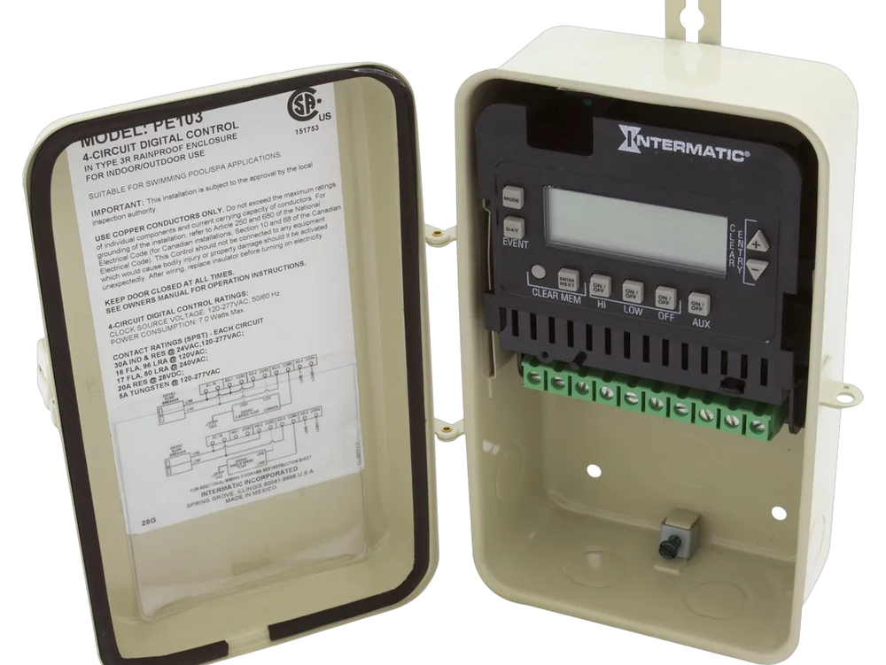 The Intermatic PE103 is an electronic pump motor controller designed for managing single and two-speed pumps, along with auxiliary pool or spa equipment. It features a programmable mechanism with four circuits housed within a Type 3R metal enclosure, which is suited for outdoor applications. The unit facilitates separate daily scheduling and includes seasonal adjustment capabilities, handling a voltage range of 120/240V and offering up to 30A and 3HP capacity.