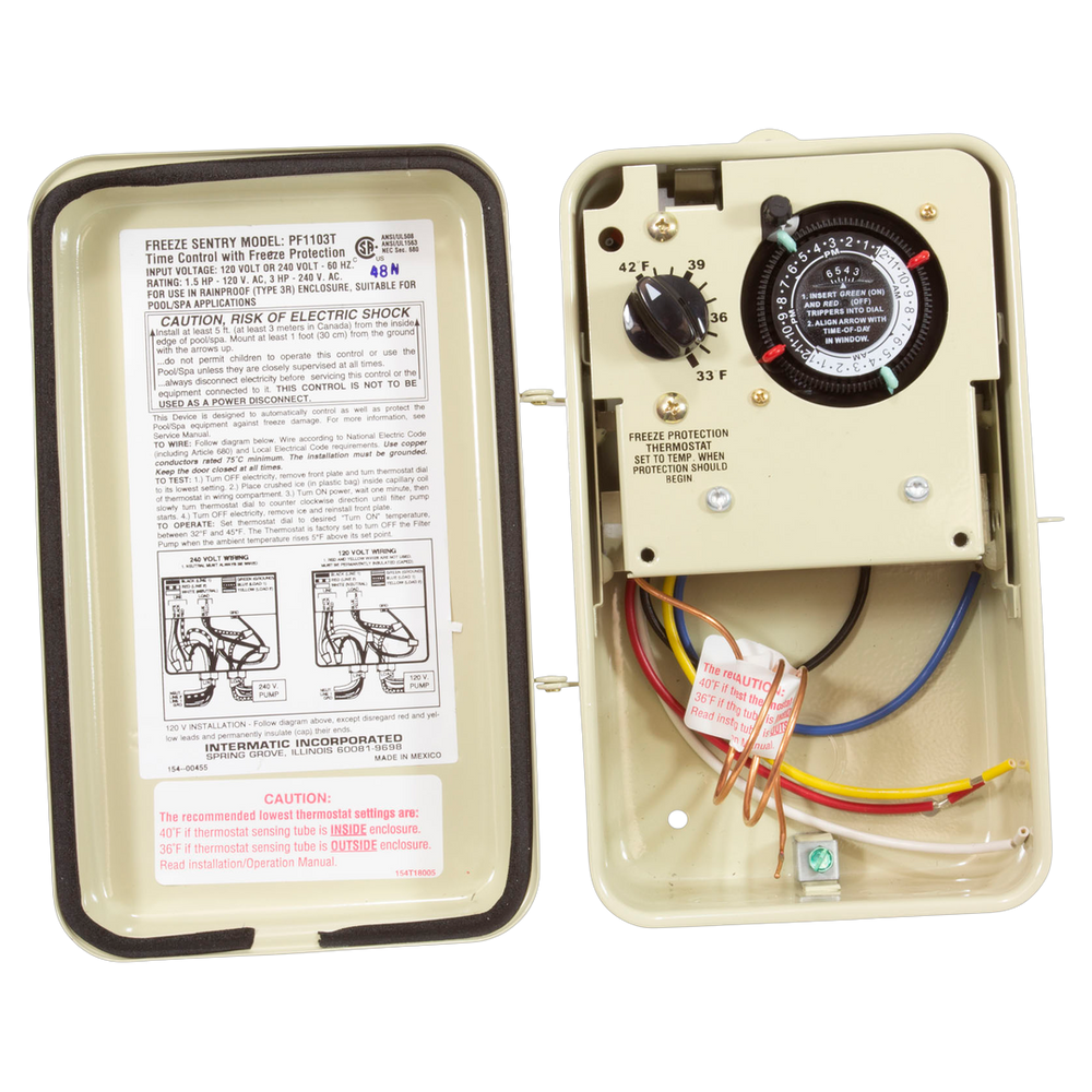 The Intermatic PF1103T is a freeze protection timer with a built-in thermostat, designed to activate pool and spa pumps and heaters to prevent freeze damage. It operates on 120/240V and features a durable rainproof metallic enclosure suitable for both indoor and outdoor use. This device is essential for safeguarding plumbing and equipment against freezing temperatures.