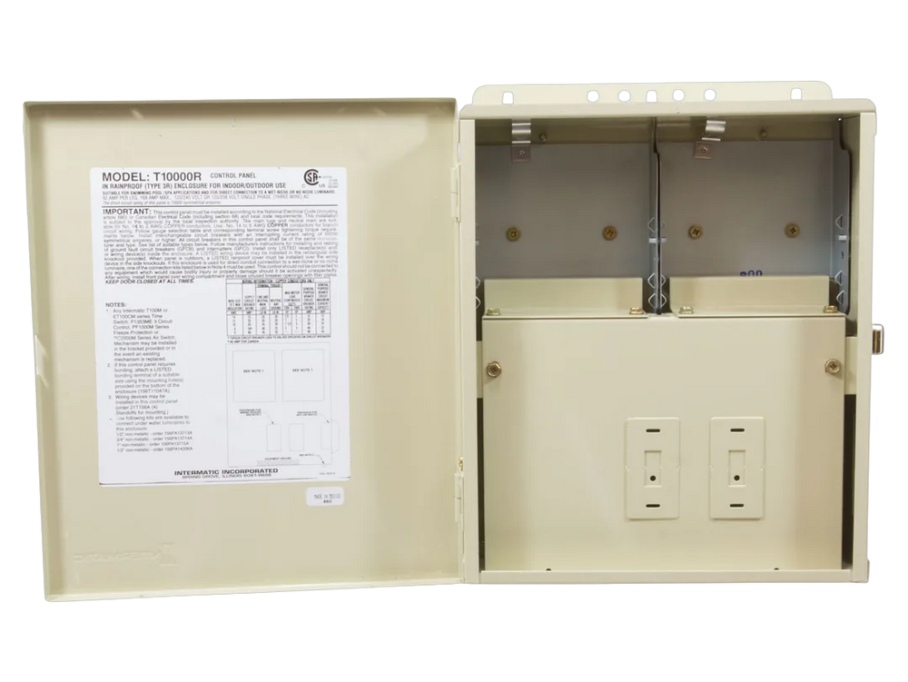 The Intermatic T10000R is a pool and spa control panel available as an enclosure only, designed to serve as a versatile power center. It features a heavy-duty Type 3R rated enclosure with dimensions of 12x12x4.5 inches and is compliant with CSA (Canada and US) standards, ensuring robust motor/pump control. The unit accepts combinations of PF1000M, P1403ME, P1353ME, P4043ME, and P4243ME mechanisms for a complete control system.