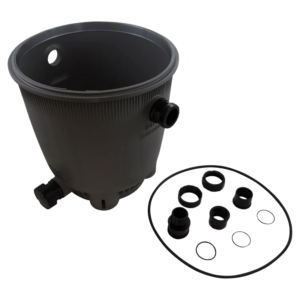 The Jandy R0465400 is a tank bottom assembly designed for use with Jandy CV and CL series cartridge pool and spa filters, specifically models CV340, CV460, and CV580. This replacement part includes necessary components such as bulkheads, unions, O-rings, and an inlet elbow. It serves as the base component of the filter system.
