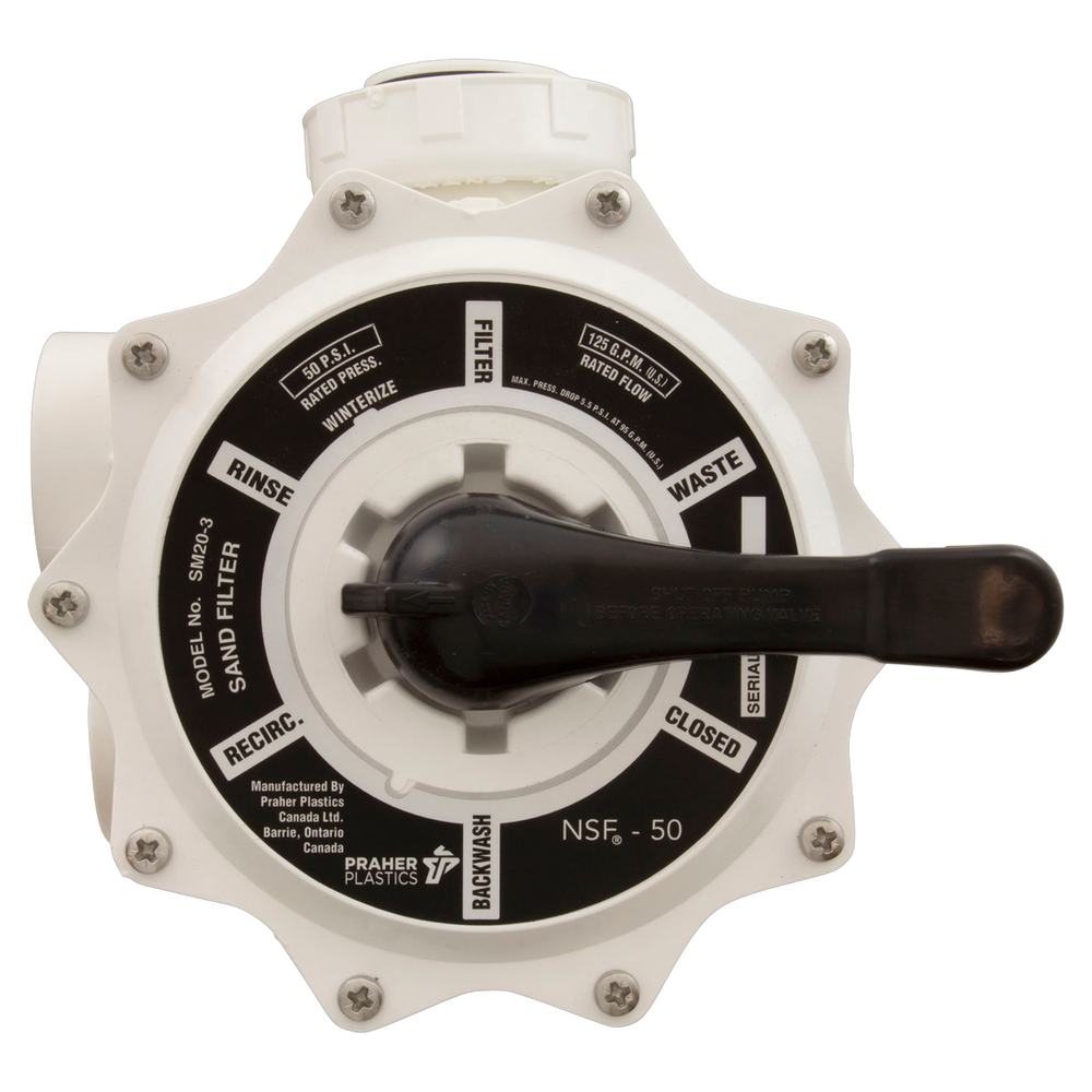 The Praher SM2-PP3 is a side mount multiport valve designed for Triton sand filters. It facilitates efficient water flow control for pool and spa systems, allowing for functions such as backwashing and rinsing. This valve is compatible with various Pac Fab tank models, making it a suitable replacement part for those systems.