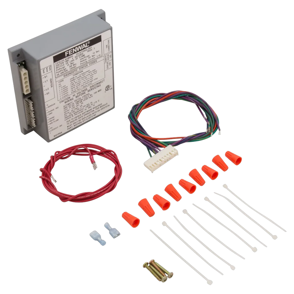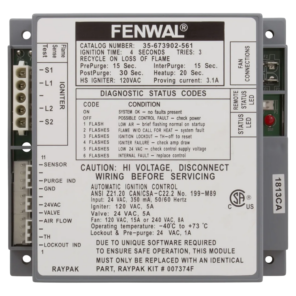 The Raypak 007374F is an ignition control module designed for use with Raypak heater models, specifically the 992A-2342A and Hi Delta 302A/B - 902A/B. This part operates at 24 volts and is a direct replacement for the original ignition control, facilitating the ignition process in heating systems.