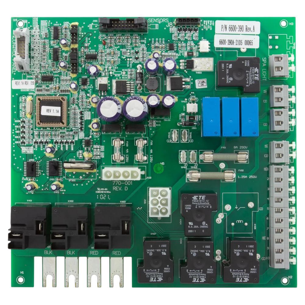 The Sundance Spas 6600-390 is a control circuit board (PCB) for the 880 Series NT platform. It is a printed circuit assembly with LCD interface support, built for 60 Hz operation and two-pump configurations incorporating PermaClear. Used in 2008+ 880 NT systems on Majesta, Altamar, Marin, and Capri (approx.