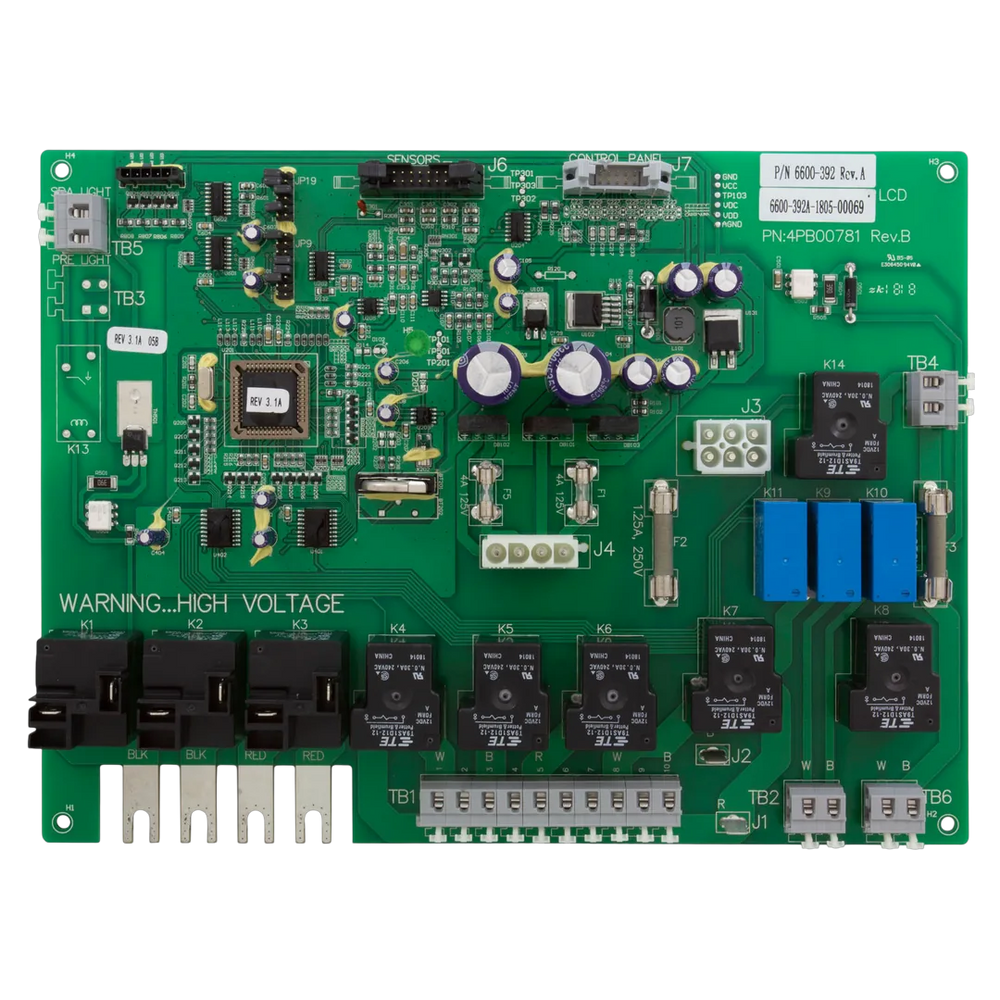 The Sundance Spas 6600-392 is a printed circuit board (PCB) for 880 Series control systems. It is a 3-pump, 60 Hz logic board with LCD topside support and chip/processor rev 3.1A+, with provisions for PermaClear/UV counter, indicator light, and Smart Logic; it replaces 6600-155, 6600-160, and 6600-398. Compatible with 880 Series Maxxus and Aspen configurations (commonly 2014-2015 builds and also referenced for 2005-2008), and also listed for select Jacuzzi J-400 (2006-2009) and J-300 LCD models.