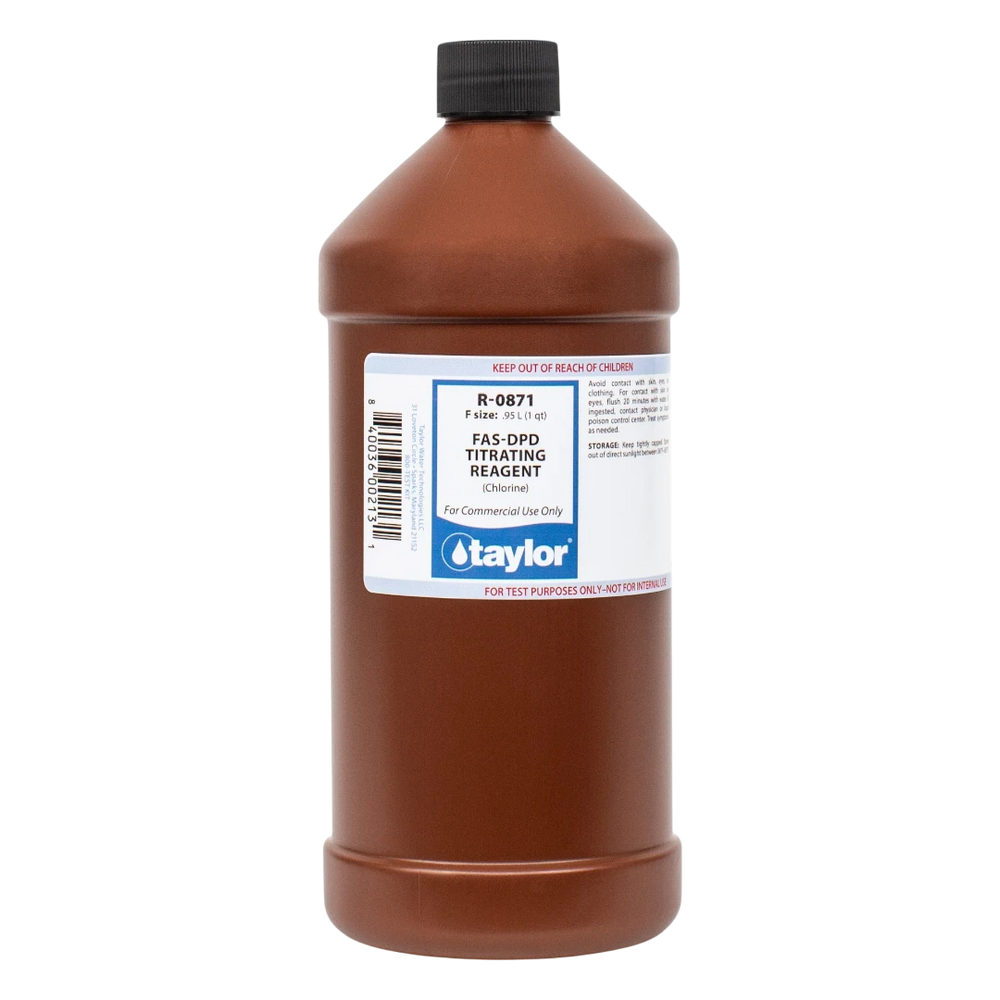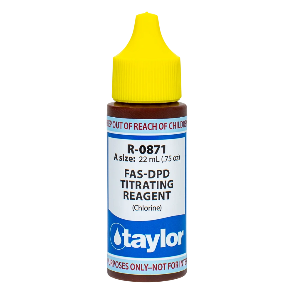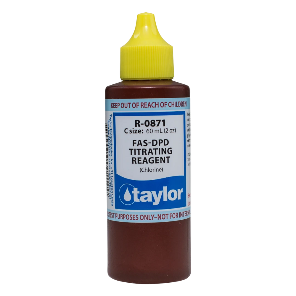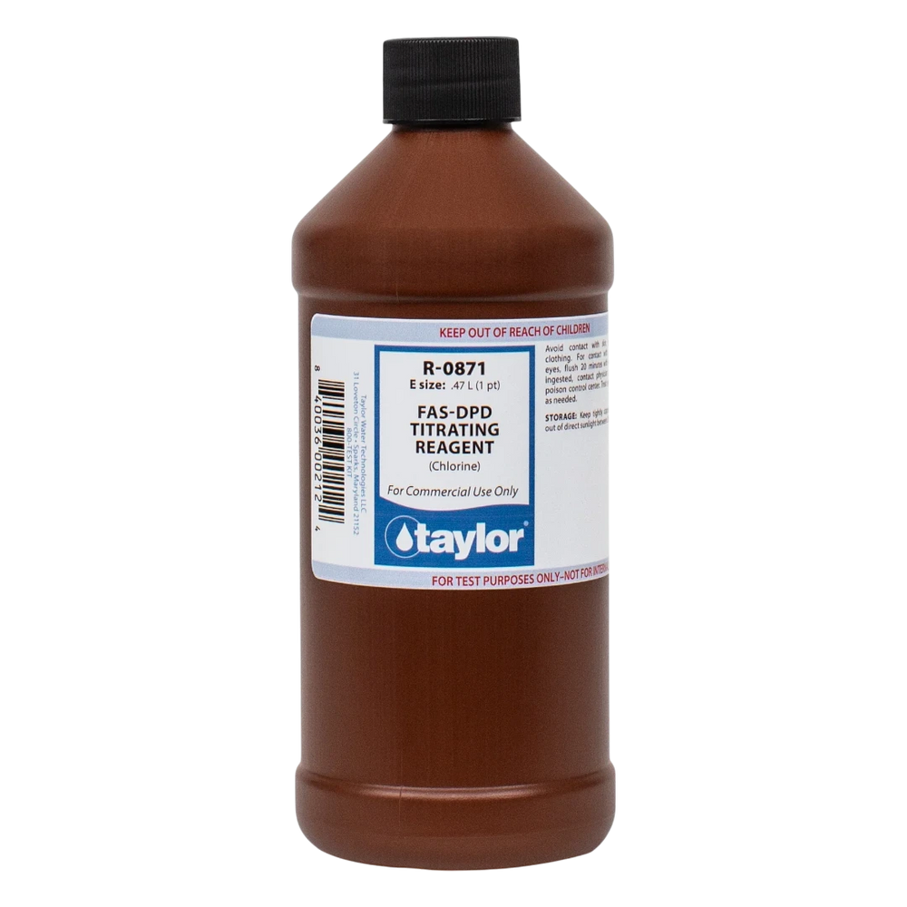 The Taylor R-0871 FAS-DPD Titrating Reagent is a high-precision testing solution designed for accurate chlorine and bromine level analysis in pools and spas. As part of the FAS-DPD testing method, this reagent allows users to perform drop-by-drop titrations for precise free and combined chlorine measurements, making it an essential tool for maintaining optimal water balance. Ideal for both residential and commercial pool owners, it ensures safe, sparkling water while preventing overchlorination or underchlorination. The R-0871 reagent is compatible with Taylor test kits, offering reliability and consistent results for professional-grade pool maintenance.
