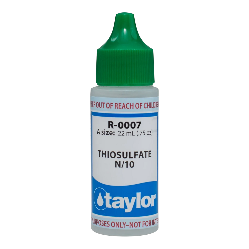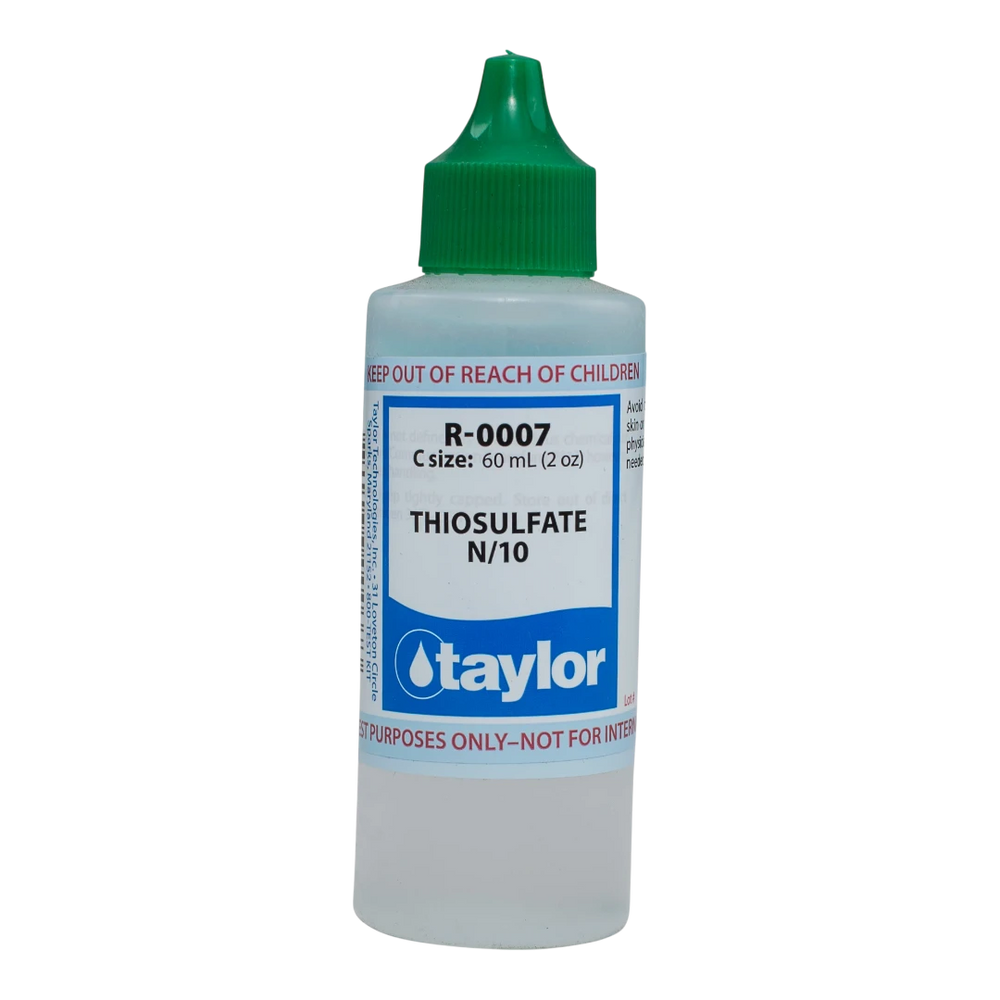 The Taylor R-0007 reagent is a thiosulfate solution designed to be used as a replacement in Taylor water testing kits. It is primarily utilized to neutralize chlorine, bromine, or ozone, aiding in the preparation for Total Alkalinity tests in pool and spa water. Available in different sizes, it ensures users can maintain accurate water quality assessments.