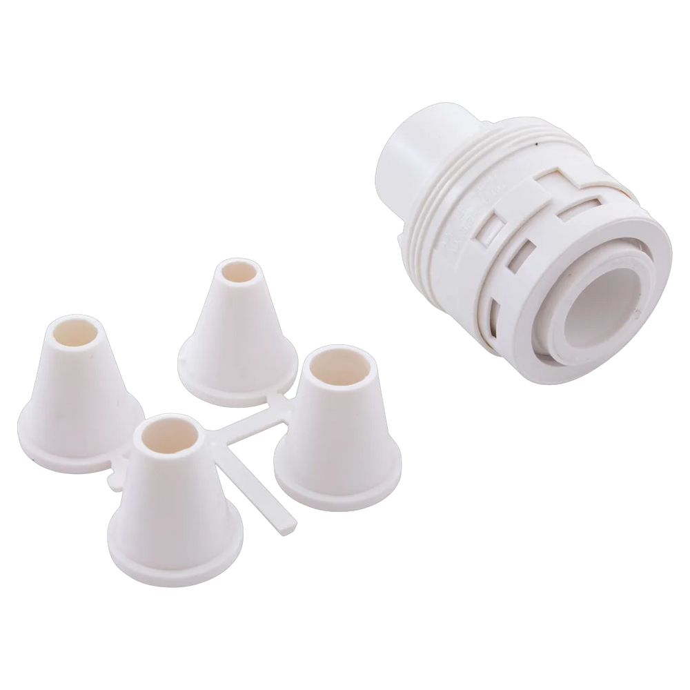 The Waterway 210-8750 is a Monster Poly Jet Internal nozzle designed for spa applications. It features a caged-style construction with orifice sizes ranging from 5/16" to 1/2". This white spa jet internal part is suitable for a broad range of spa systems, enhancing hydrotherapy with a strong, directional water flow.