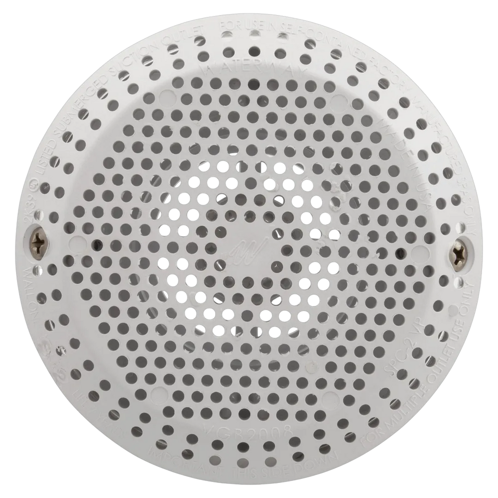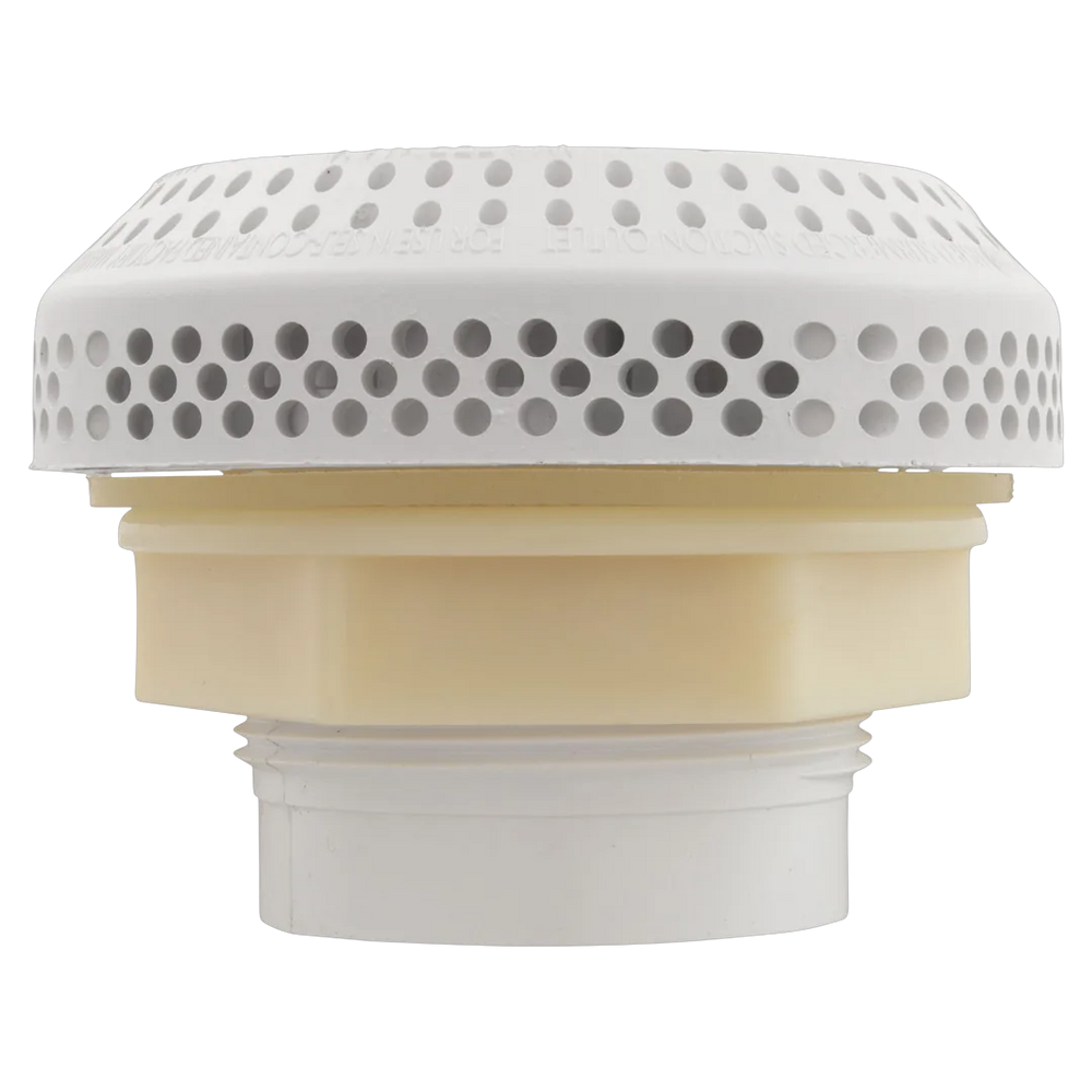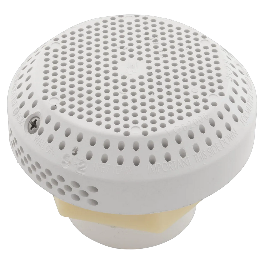 The Waterway Plastics 640-3250V is a Hi-Flo suction assembly (VGB compliant) for spas and hot tubs, sold as a white, 3.5" face wall fitting. It is molded thermoplastic with a 1-1/2" plumbing socket (1-1/2" slip), hex nut wall fitting, supplied without a vacuum breaker, rated at 128 GPM, and has a cover diameter of about 3-3/4" with a ~2-3/8" mounting hole requirement. Compatible with self-contained spa and hot tub plumbing systems using 1-1/2" lines and standard 2-3/8" wall cutouts.